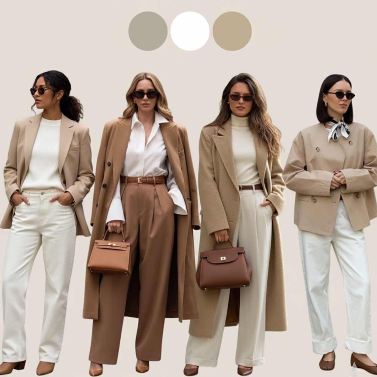 Come indossarlo: blazer beige strutturato su pantaloni bianchi ampi, oppure cappotto beige lungo su completo total white. Gli accessori in cuoio o marrone chiaro completano l’outfit in armonia cromatica.