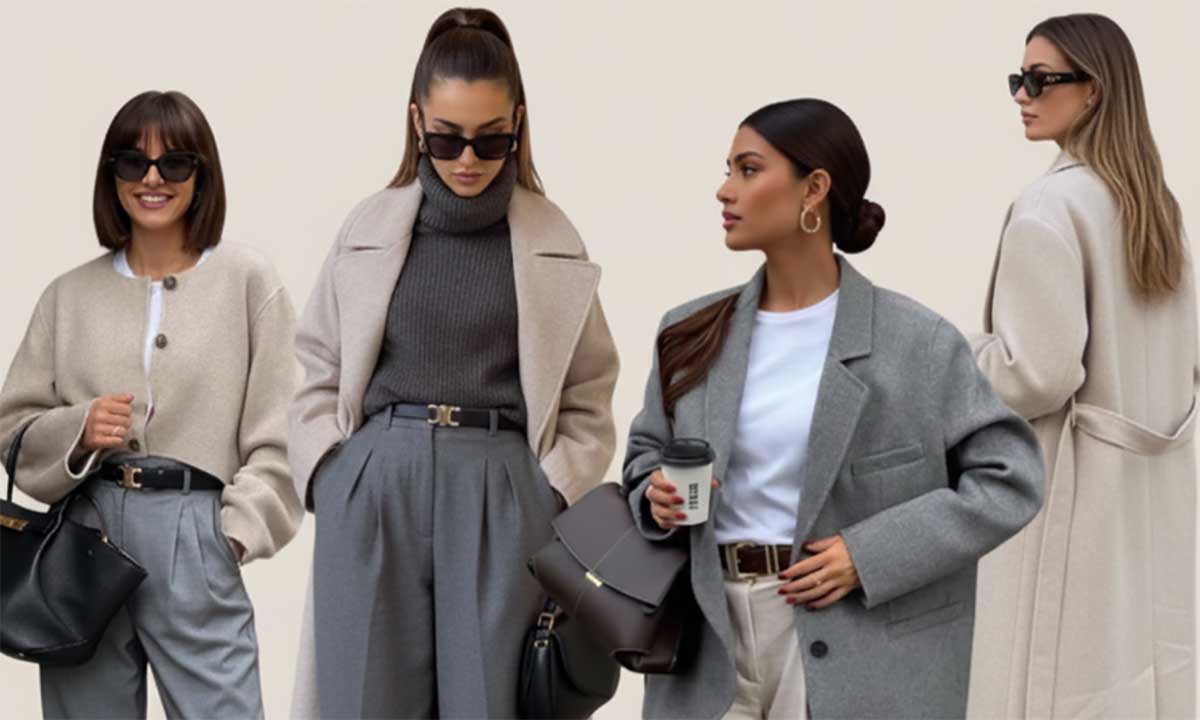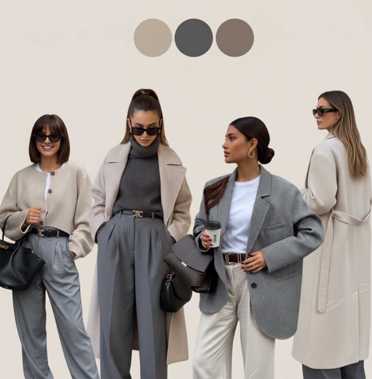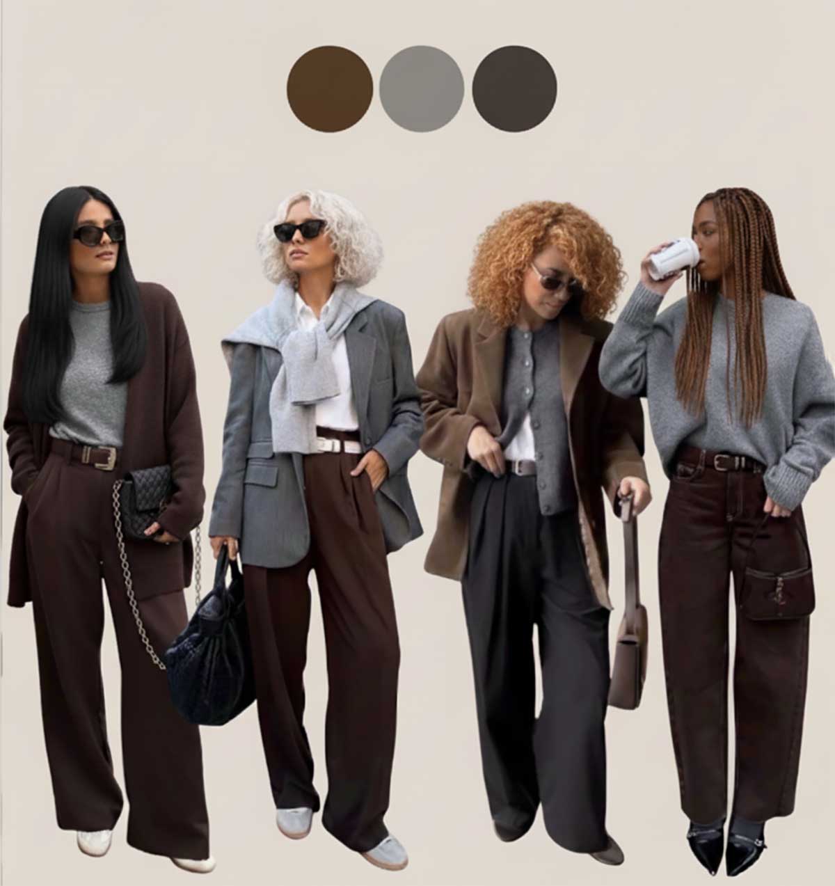 Come indossarlo: cappotto lungo grigio antracite su completo avena, oppure blazer grigio scuro su pantaloni larghi color avena. Funziona benissimo anche con la maglieria oversize: cardigan grigio su maglia in cachemire avena. Il segreto è mantenere le linee pulite e scegliere composizioni di qualità: lana bouclé, cashmere, flanella.
