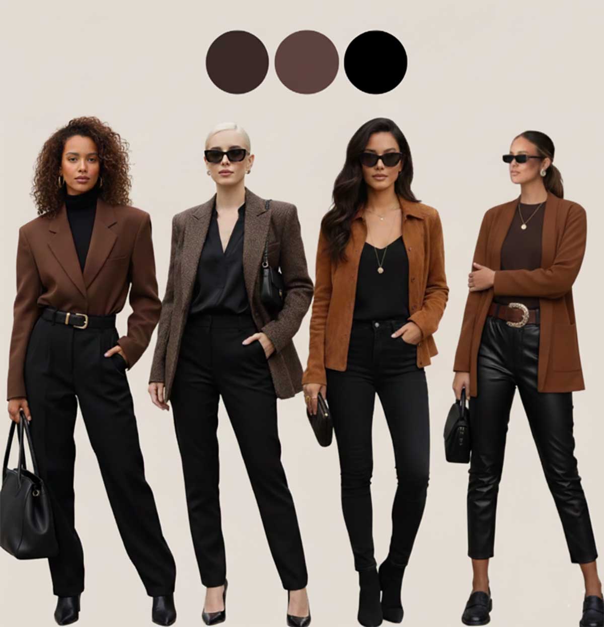 Come indossarlo: blazer oversize marrone espresso su total black, oppure cappotto nero su abito o completo color cioccolato fondente. Il segreto è mantenere il marrone nelle tonalità più scure possibili, quasi indistinguibili dal nero a prima vista. Gli accessori possono riprendere entrambi i toni o aggiungere una nota calda con la pelle marrone.