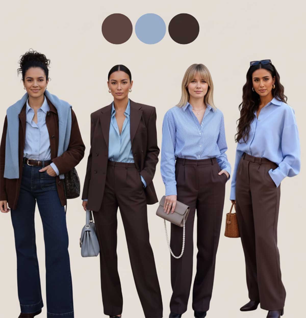 Come indossarlo: blazer moka oversize su camicia celeste (lasciata morbida), oppure completo marrone con camicia azzurra e jeans. Funziona anche con la maglieria: cardigan o maglione moka su pantaloni scuri e camicia celeste. La chiave è il celeste che “dà respiro” tra i pezzi più scuri, portando leggerezza all’outfit senza che quest’ultimo risulti troppo primaverile.