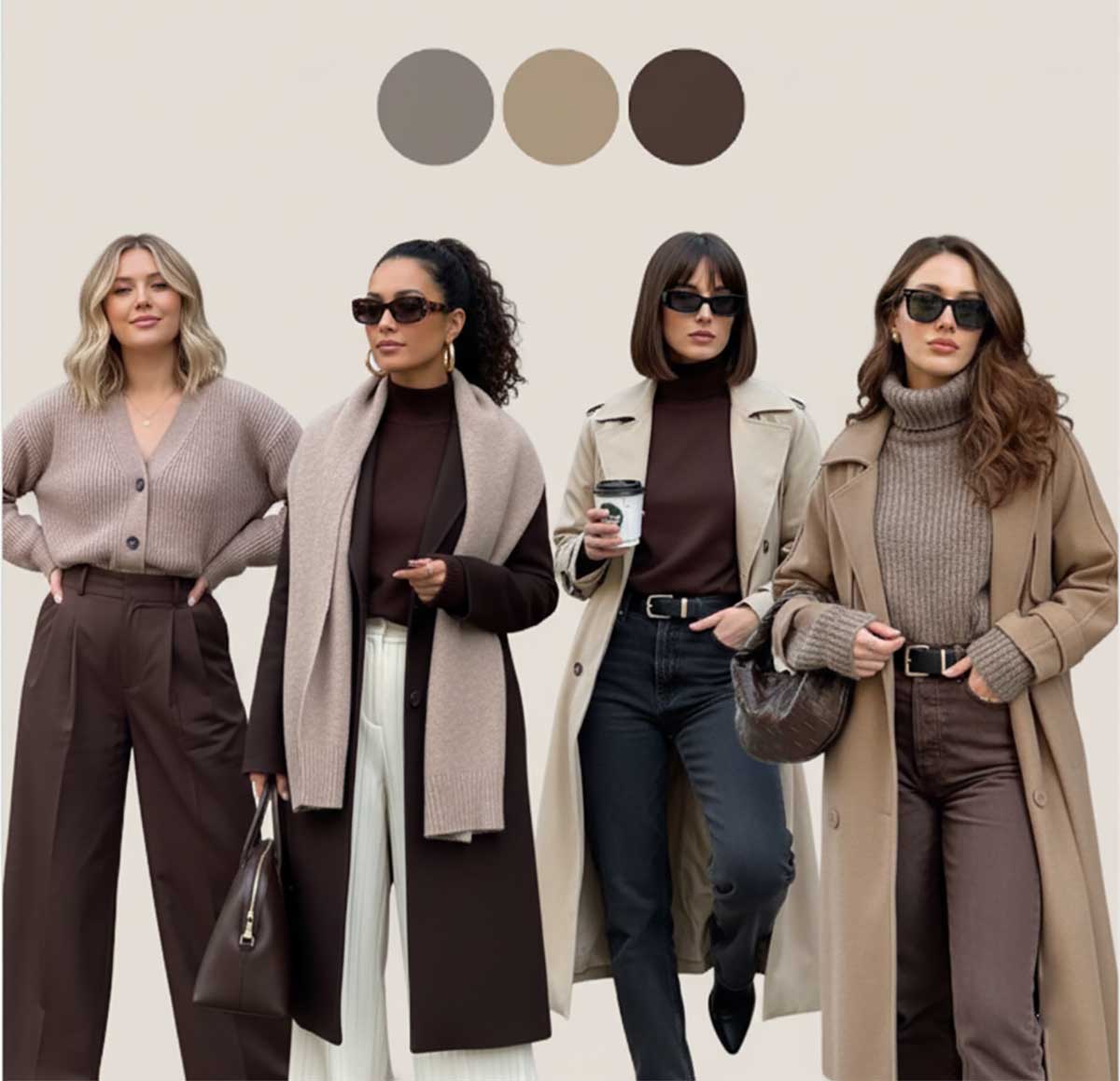 Il taupe (quella tonalità tra grigio e marrone) trova finalmente senso abbinato a dei marroni più decisi. È la combinazione perfetta per chi ama i toni caldi ma vuole un tocco più chic rispetto all’abbinamento monocromatico.