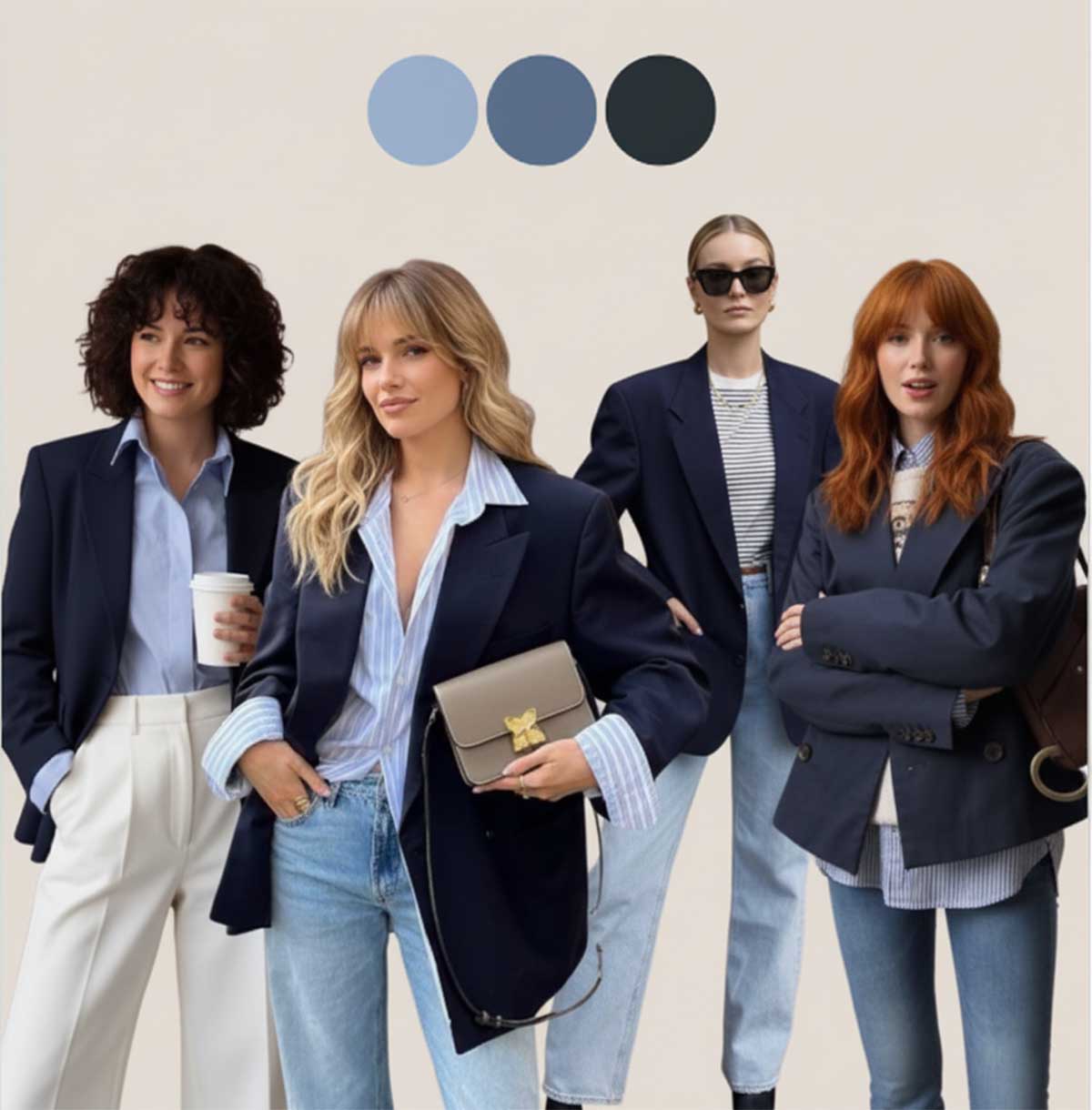 Come indossarlo: blazer navy su camicia azzurro chiaro e jeans, oppure cappotto navy sopra ad un maglione celeste. Il denim funziona benissimo. La camicia azzurra, magari dal taglio maschile oppure oversize, è il pezzo chiave di questa combinazione.