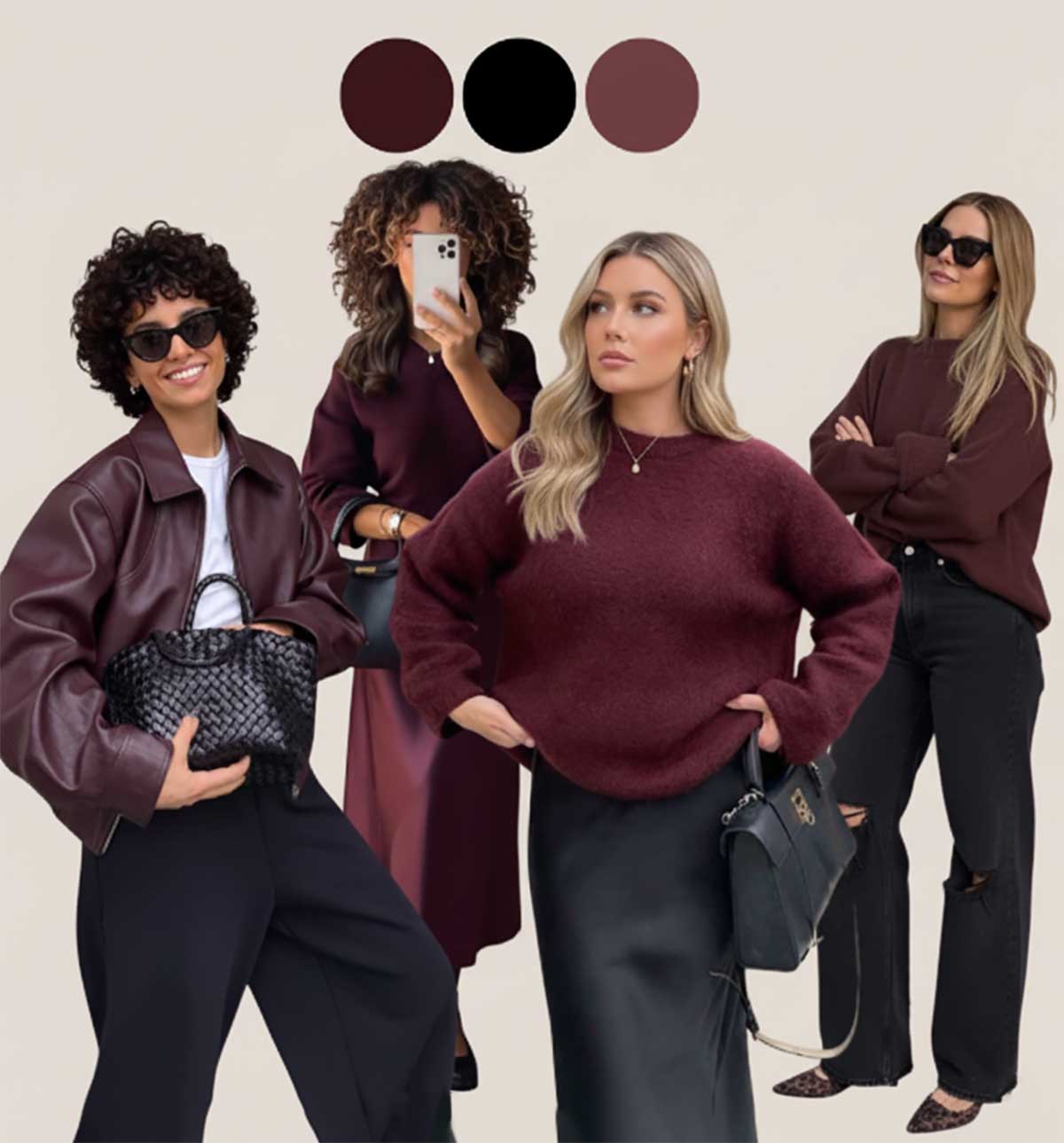 Come indossarlo: cappotto o giacca in pelle bordeaux su un outfit total black, oppure maglione bordeaux con pantaloni e accessori neri. Il bordeaux può essere lucido (pelle, vernice) o opaco (cachemire, lana, viscosa), ma mantiene sempre la sua eleganza. Per ammorbidire leggermente, sostituisci il nero con grigio antracite molto scuro. Gli accessori in pelle nera o bordeaux completano il look.