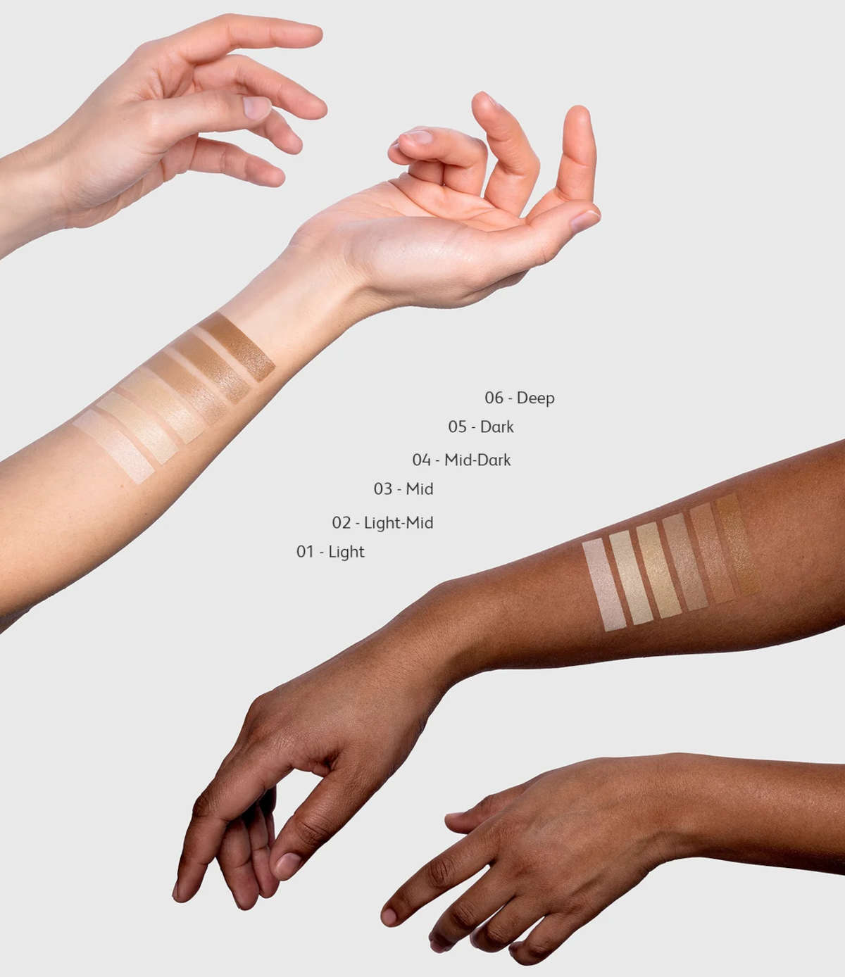 La gamma cromatica comprende 6 colorazioni, dalla chiarissima Light fino alla scura Deep, con sottotoni neutri, freddi e caldi.
