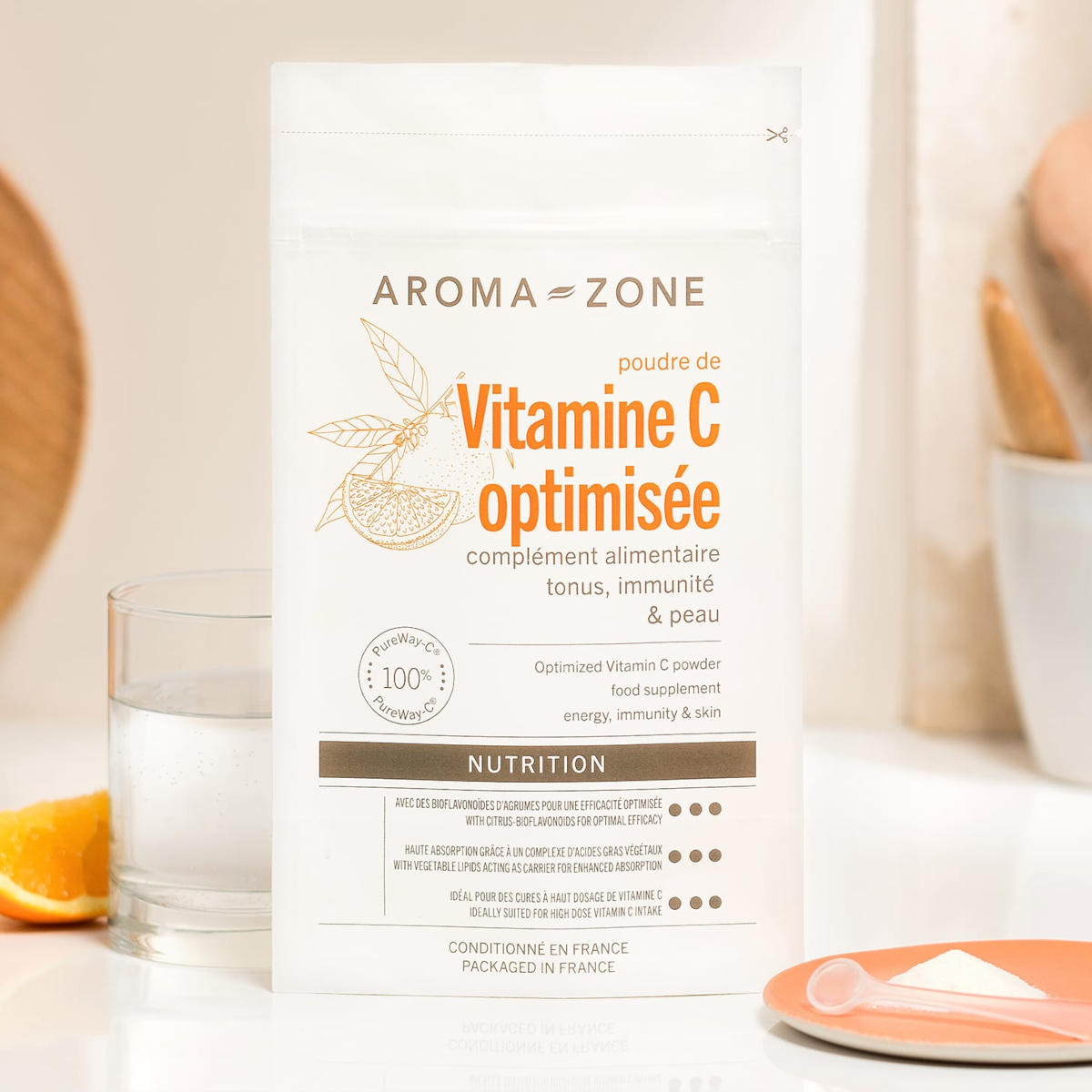 Quali integratori scegliere? La vitamina C ottimizzata Aroma Zone è formulata in associazione con un complesso di lipidi vegetali e bioflavonoidi di agrumi, elementi che ne favoriscono l’assorbimento da parte dell’organismo e migliorano la tollerabilità a livello digestivo.