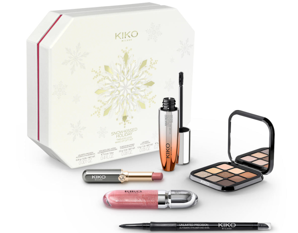 All’interno della fornitissima collezione make up KIKO Natale 2025 Snow-kissed Holiday troviamo questo kit regalo completo, perfetto per tutte quelle ragazze già abituate a truccarsi quotidianamente. Timeless Look comprende: palette ombretti, eyeliner, mascara, rossetto e lip gloss (disponibile qui).
